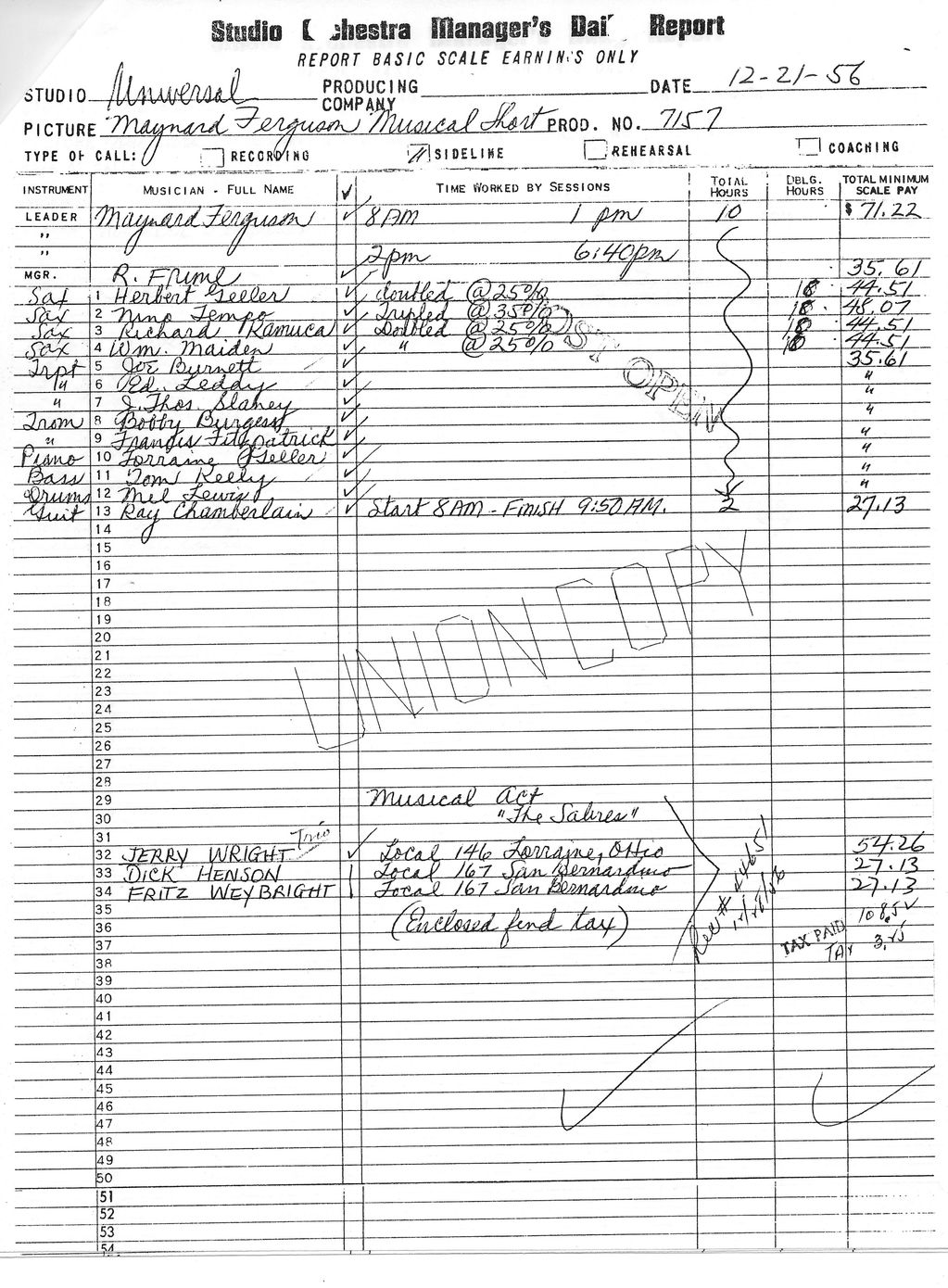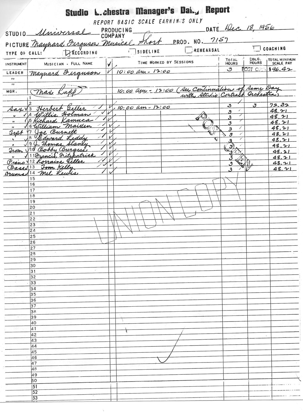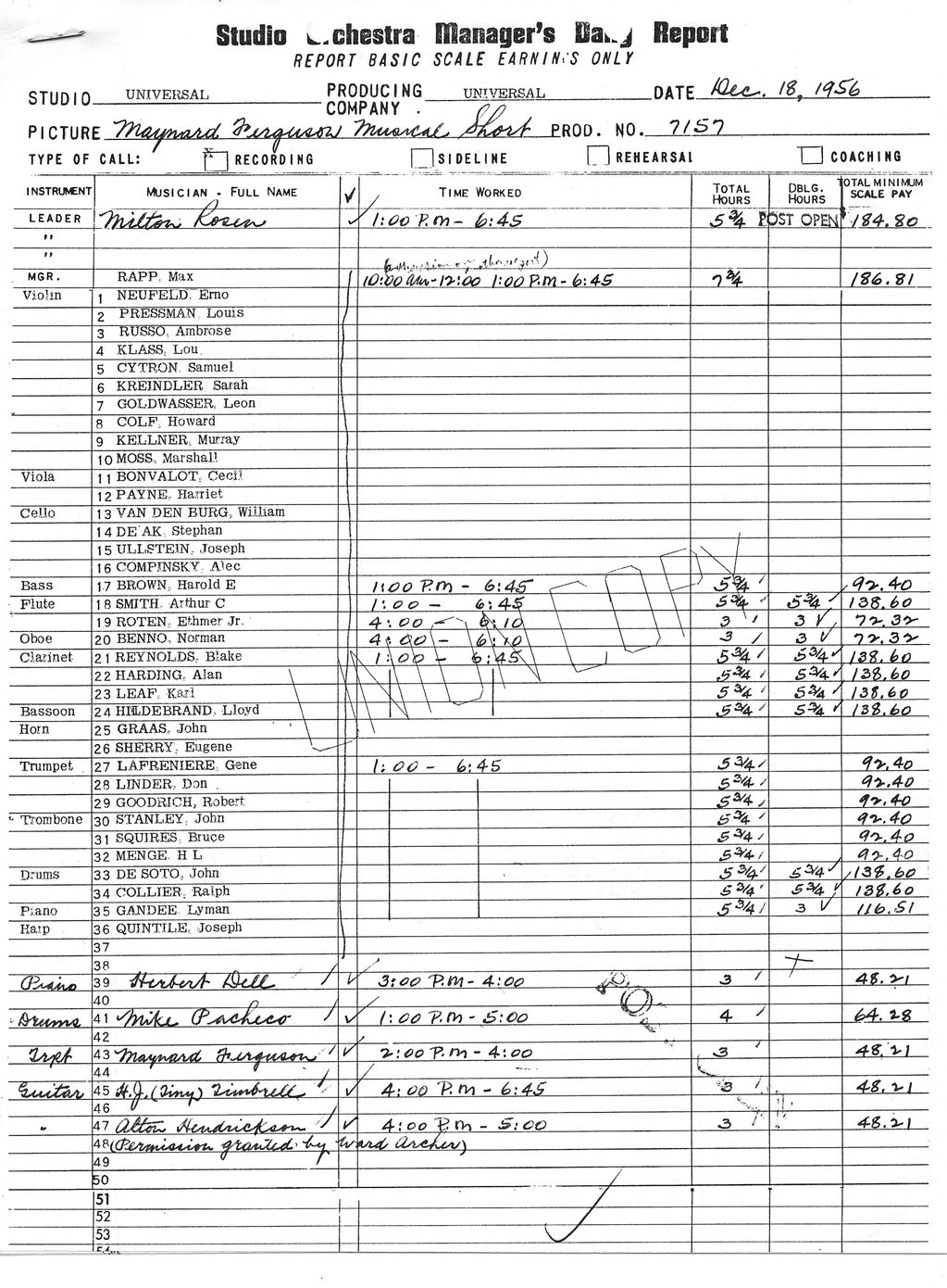 Universal Studio Manager’s Daily Report recording (audio only) contract from December 18, 1956 for the “Maynard Ferguson Musical Short (7157),” listing extra musicians. Courtesy of Mark Cantor