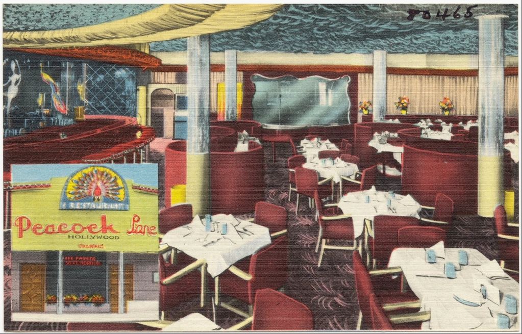 A mid-late 1950s vintage postcard of the Peacock Lane jazz room in Hollywood