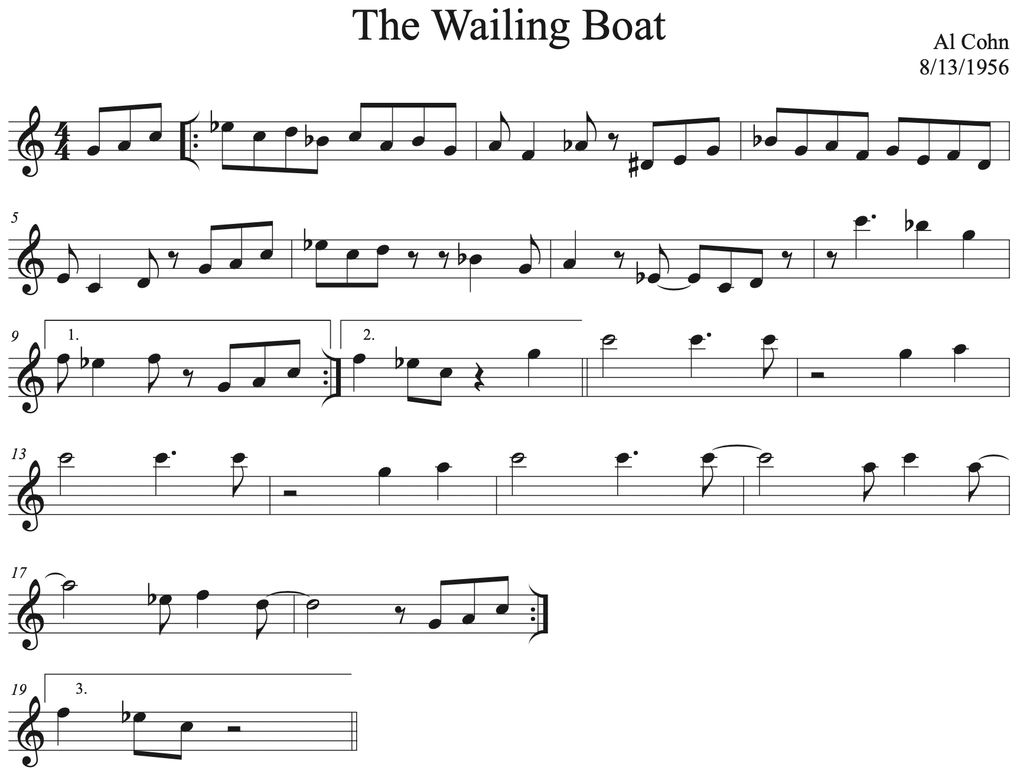 Al Cohn’s Sketch of “The Wailing Boat,” represented here digitally engraved by Matt Vashlishan and reproduced exactly from AC’s handwriting in terms of notation and layout (notice the repeats, endings and eighth note beaming).